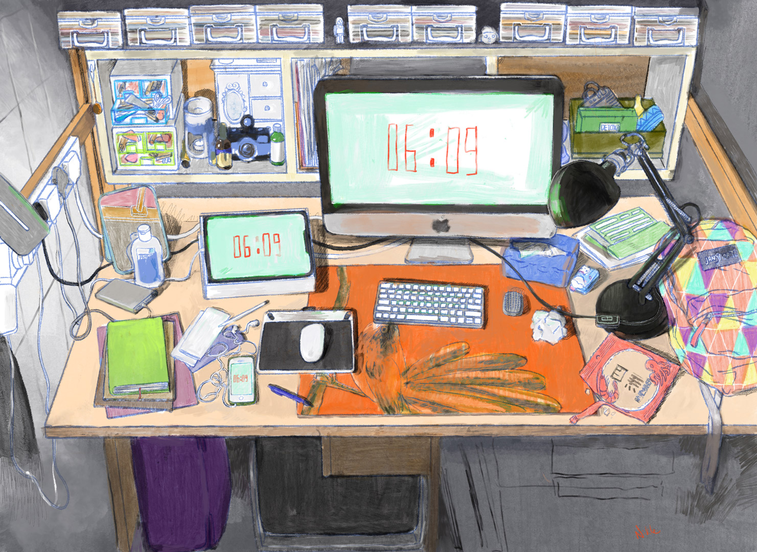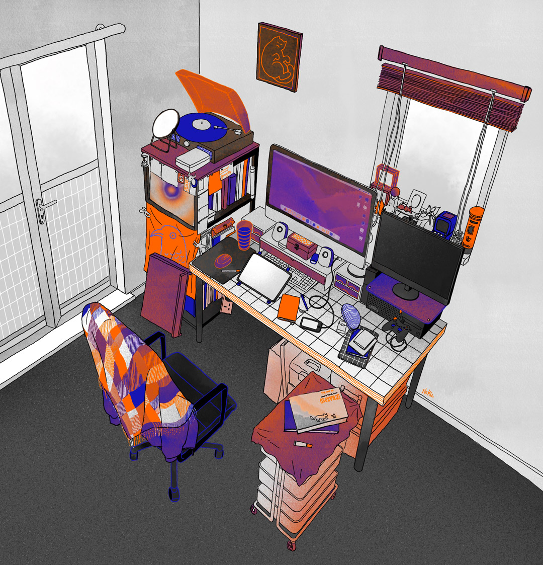 This is another drawing from 2019. Back then, my workstation was underneath my bed — a tiny space with stuff all around me. It was messy, but I still enjoyed working there.